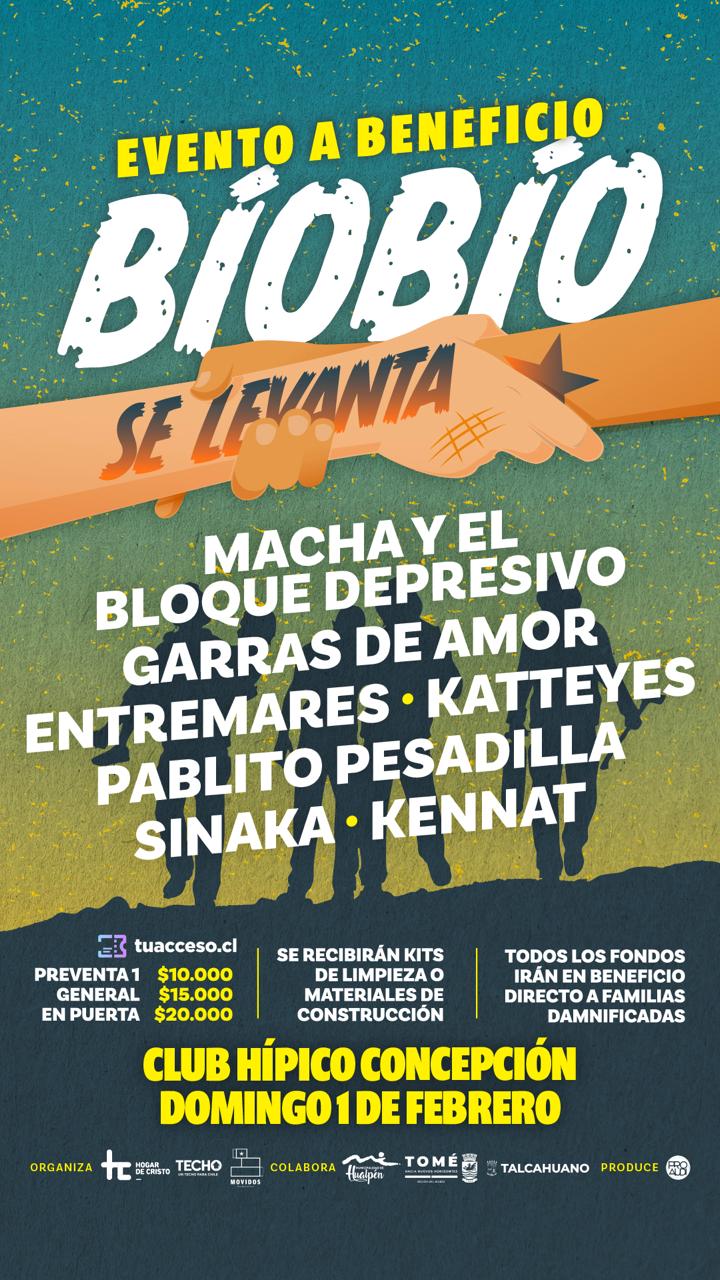 En Tomé, con la presencia de su alcalde y los ediles de Talcahuano y Hualpén, Hogar de Cristo, TECHO‑Chile y Movidos x Chile reforzaron el llamado a asistir al concierto solidario “Biobío se levanta”. La cita es este 1 de febrero en el Club Hípico de Concepción. Macha y el Bloque Depresivo y otros importantes artistas se han sumado al objetivo de recaudar fondos para familias afectadas por los incendios en Biobío en la región.